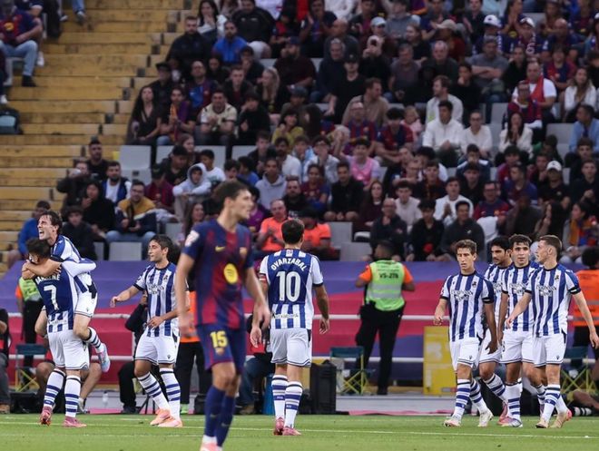 第69分钟,莱万多夫斯基小角度射门被挡了出去。4分钟后,久保健英劲射击中立柱弹出底线。随后,亚马尔单刀推射破门,但因为越位被吹掉。第82分钟,孔德犯规,被出示黄牌。第85分钟,莱万多夫斯基门前包抄射门,结果皮球击中门框弹了出去。最终,巴萨2-1逆转击败皇家社会。巴萨联赛豪取4连胜,4场狂轰14球。巴萨以19分超越18分的皇马,成为新领头羊。